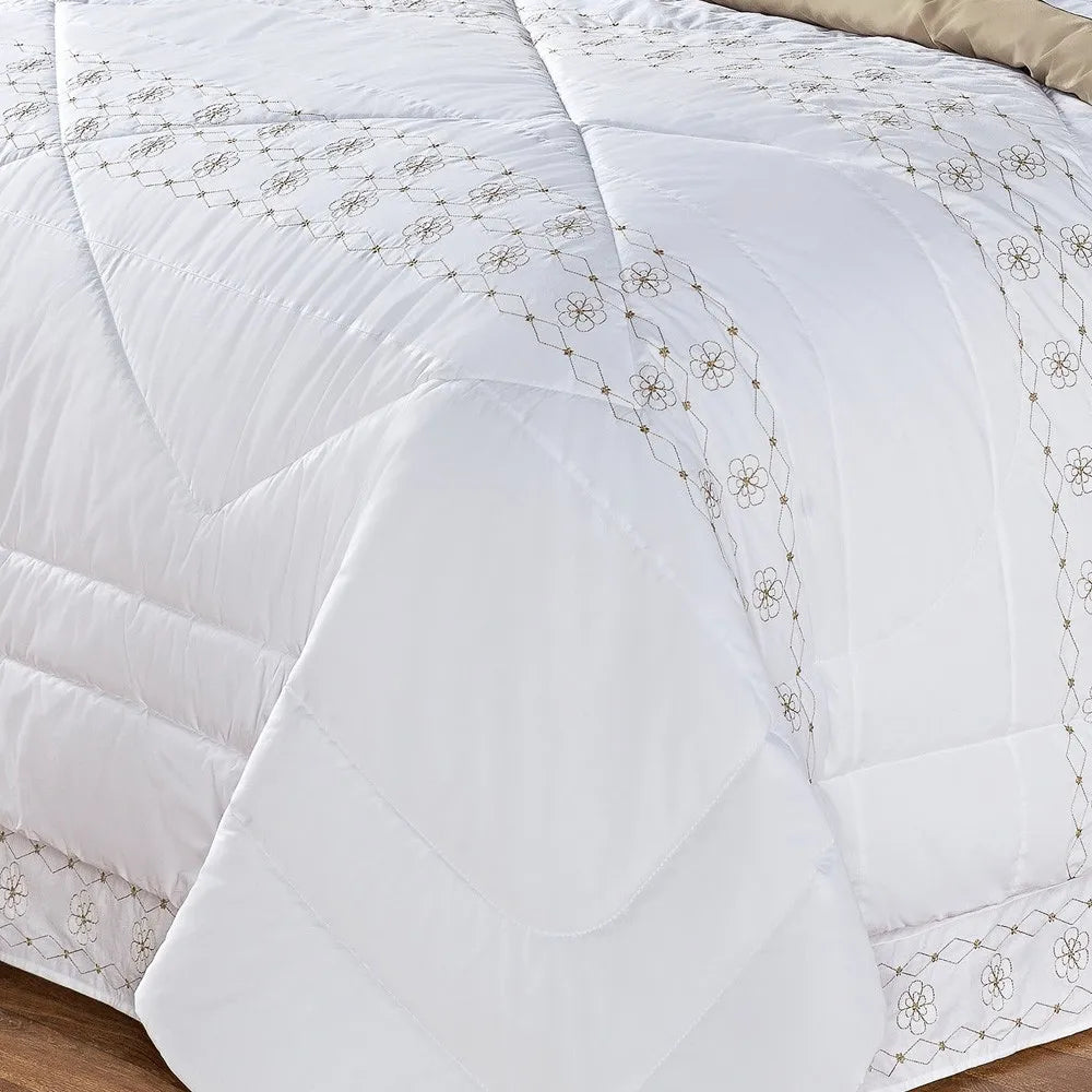 Renove o visual do seu quarto com o luxuoso Kit Edredom King Dupla Face Damasco. Feito em 100% algodão percal 200 fios, o tecido oferece um toque macio, fresco e resistente, garantindo conforto absoluto em todas as estações. Com design dupla face (branco e bege), o conjunto permite alternar facilmente o estilo do ambiente.